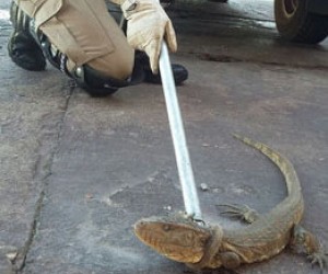 Ao levantar para fazer café hoje cedo, moradora se deparou em sua cozinha com uma iguana, também conhecida como víbora do Pantanal e acionou equipe do Corpo de Bombeiros para capturá-la. Fato aconteceu em residência localizada na Avenida 14 de Março, centro de Ladário.
