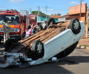 Homem de 51 anos ficou ferido depois de bater o carro que conduzia em um veículo estacionado e capotar, na tarde de hoje, no Jardim Tijuca, em Campo Grande. Condutor aparentava estar embriagado.