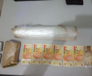 Os policiais entraram no quintal e constataram que se tratava de um papelote com 440 gramas da droga. Em revista pessoal a polícia encontrou com o suspeito uma carteira com 6 notas de R$ 20 e uma nota de R$ 50 falsificadas.