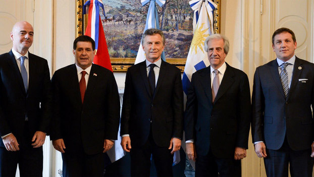 Argentina, Paraguai e Uruguai formam uma candidatura conjunta para a Copa do Mundo de 2030. A intenção dos três países de sediar o Mundial era conhecida, mas, em cerimônia nesta quarta-feira, na Casa Rosada, sede do governo argentino, a proposta ficou concreta. Estiveram presentes no encontro os mandatários da Fifa, Gianni Infantino, da Conmebol, Alejandro Domínguez, e os presidentes dos três países: Mauricio Macri (Argentina), Horacio Cartes (Paraguai) e Tabaré Vázquez (Uruguai), além de membros dos governos das três nações.