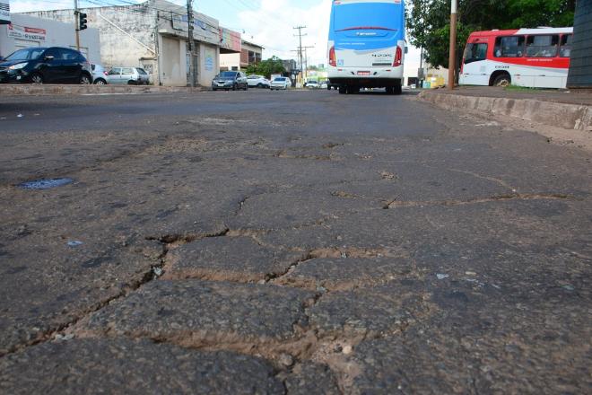 O excesso de peso de caminhões em uma das principais vias da Capital resultou em um asfalto desnivelado, semelhante a uma colcha de retalhos