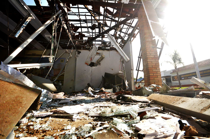 Bandidos encapuzados e fortemente armados explodiram dois caixas eletrônicos de uma agência do Banco do Brasil localizada nas dependências da Associação dos Criadores de Mato Grosso do Sul (Acrissul), no Parque de Exposições Laucídio Coelho, em Campo Grande. O crime aconteceu por volta das 2h30 da madrugada desta quarta-feira e terminou em troca de tiros com a Polícia Militar. Pelo menos seis autores participaram do assalto e conseguiram fugir.