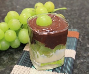 Derreta o chocolate em banho-maria, espalhe delicadamente sobre o creme do refratário e decore com as uvas cortadas ao meio (empurre até a metade)