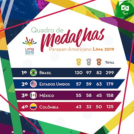O time brasileiro é o líder disparado do quadro geral do Parapan, com 120 ouros, 97 pratas e 82 bronzes. Os Estados Unidos seguem na segunda colocação: 57 ouros, 59 pratas e 63 bronzes (total de 179).