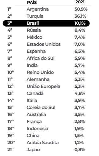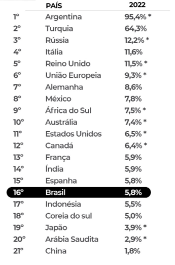 Após figurar como a terceira inflação mais alta do mundo em 2021, o Brasil reverteu o cenário de aumento dos preços. Com a queda do IPCA (Índice Nacional de Preços ao Consumidor Amplo) nos últimos meses, o país registrou a sexta menor inflação no ano passado entre os países do G-20, grupo formado pelas maiores economias e emergentes, de acordo com levantamento da Austin Rating.