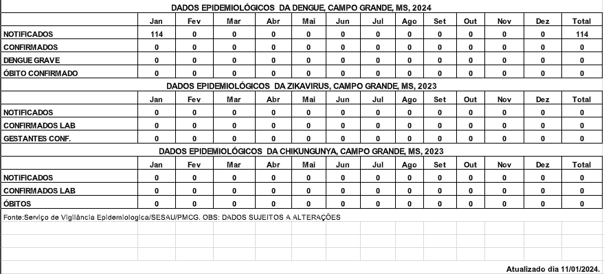 Já a Sesau aponta que são 114 casos de dengue notificados em Campo Grande. Não há nenhum óbito notificado e nenhum caso de zika ou chikungunya.