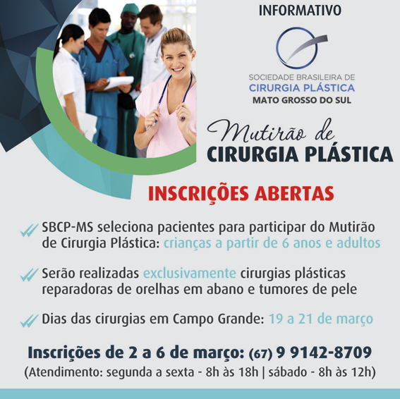 Campo Grande vai receber entre os dias 19 e 21 de março o novo mutirão de cirurgias plásticas da Sociedade Brasileira de Cirurgia Plástica (SBCP). Serão feitas exclusivamente cirurgias plásticas reparadoras de orelhas em abano e tumores de pele (benignos ou malignos), em crianças a partir dos 6 anos e adultos, sem nenhum tipo de custo para os pacientes selecionados.