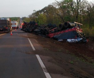 Carreta articulada tomba em rodovia e motorista escapa sem ferimentos