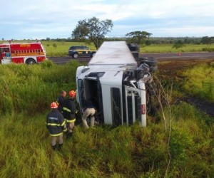 Com o impacto, o HB20 capotou e parou às margens da rodovia, enquanto a carreta de câmara fria, que seguia atrelada ao cavalo mecânico Volvo/FH 440 e conduzida por um motorista de 39 anos, perdeu o controle, invadiu a pista contrária e tombou.