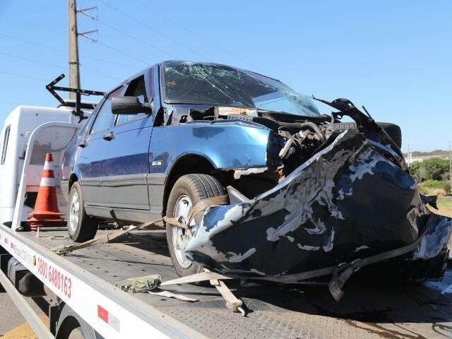 Uma colisão motivada por uma carreta Scania azul destruiu um Prêmio azul com um casal, de 41 e 39 anos, no acesso à BR-163 pela Avenida Ana Rosa Castilho Ocampo, na altura do km 487, na região do Jardim dos Novos Estados (região norte de Campo Grande). Ninguém ficou com ferimentos graves.