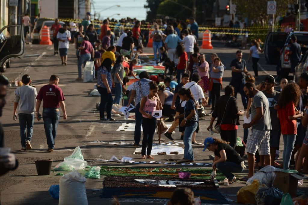 Mesmo com o clima ameno após a chuva da madrugada, centenas de pessoas de 49 paróquias de Campo Grande se reuniram desde 6h para a montagem do tapete de Corpus Christi. Será cerca de 1 quilômetro de extensão na Rua 14 de Julho, entre as avenidas Mato Grosso e Fernando Corrêa da Costa.