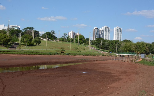 No Córrego Revellion, que passa no cruzamento das avenidas Mato Grosso e Hiroshima – e abastece os lagos –, atualmente há apenas um fio de água, quase imperceptível, em razão do grande volume de areia.