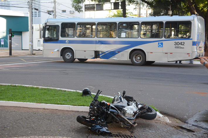 Motociclista ficou gravemente ferido depois de colidir com ônibus, por volta das 7h deste domingo (05), no cruzamento da Rua Rui Barbosa com a Avenida Afonso Pena, centro de Campo Grande. O coletivo fazia a linha União/Oliveira e transportava três pessoas - motorista e dois passageiros - que não se feriram.