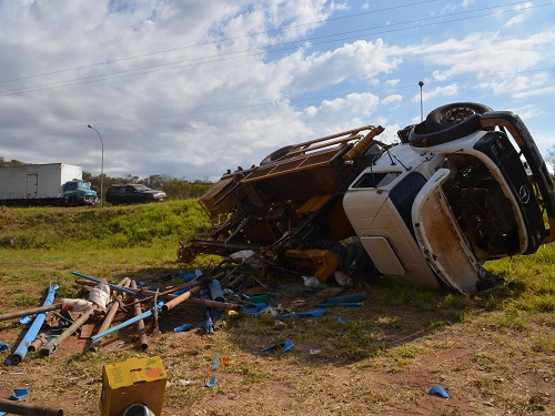 Caminhão com equipamentos para instalações de poços artesianos tombou, na tarde de ontem, na BR-060, no Bairro Cophavale, em Camapuã.