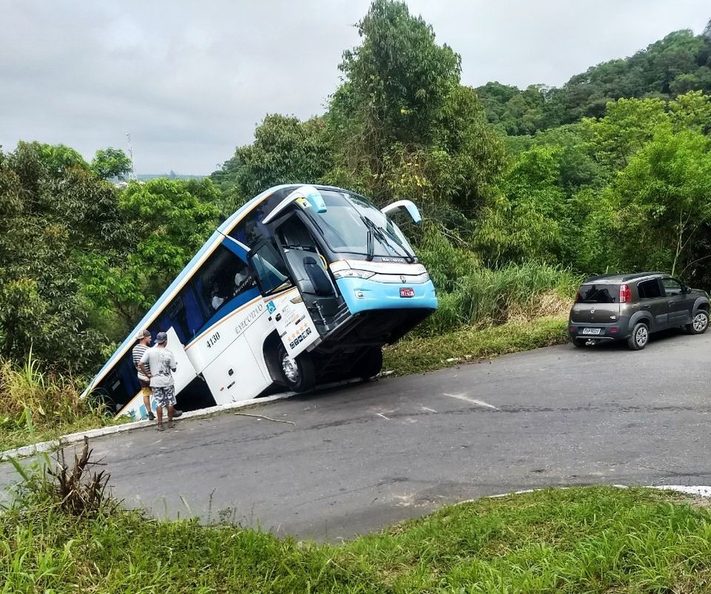 Um ônibus de viagem ficou preso em uma árvore ao sair da pista e cair na encosta do Morro do Cristo em Iguape, região do Vale do Ribeira, no litoral de São Paulo. O acidente aconteceu neste sábado (25) e não deixou feridos, segundo informações da Polícia Militar.