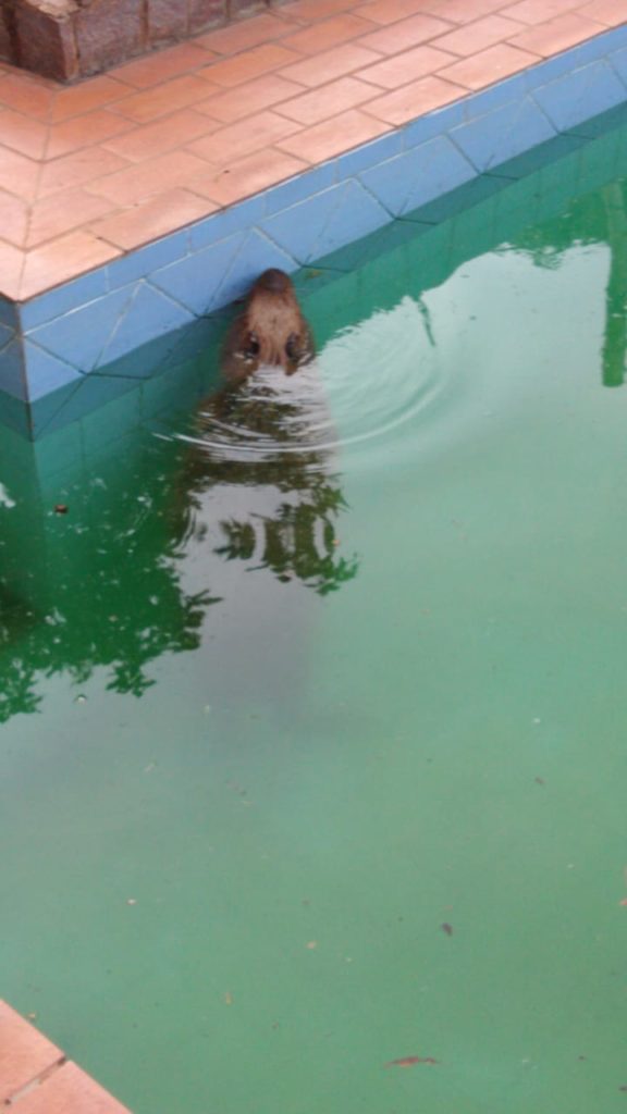 Para refrescar, capivara invade piscina e surpreende funcionários de clínica