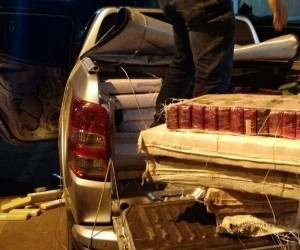 Durante perseguição, condutor perdeu o controle da direção e bateu em um poste de iluminação. No veículo foram encontrados 75 fardos de maconha e foi constatado o carro foi roubado no dia 20 de março desse ano.