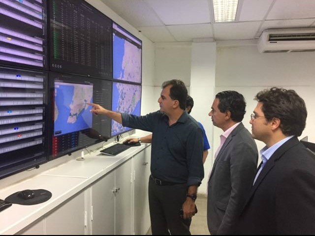 Depois de uma conversa de duas horas com o prefeito de Salvador, Antônio Carlos Magalhães Neto (DEM), o prefeito eleito de Campo Grande, Marquinhos Trad (PSD), visitou a central de monitoramento do transporte coletivo da capital baiana.