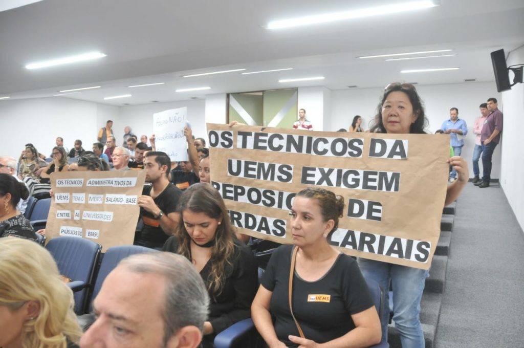 Na entrada do plenário, técnicos da Universidade Estadual de Mato Grosso do Sul (UEMS) exibiram um caixão em que diziam que eles recebem o “pior salário do país”. Professores e outros servidores montaram uma tenda do lado de fora da Casa de Leis em que criticavam a proposta do Governo.