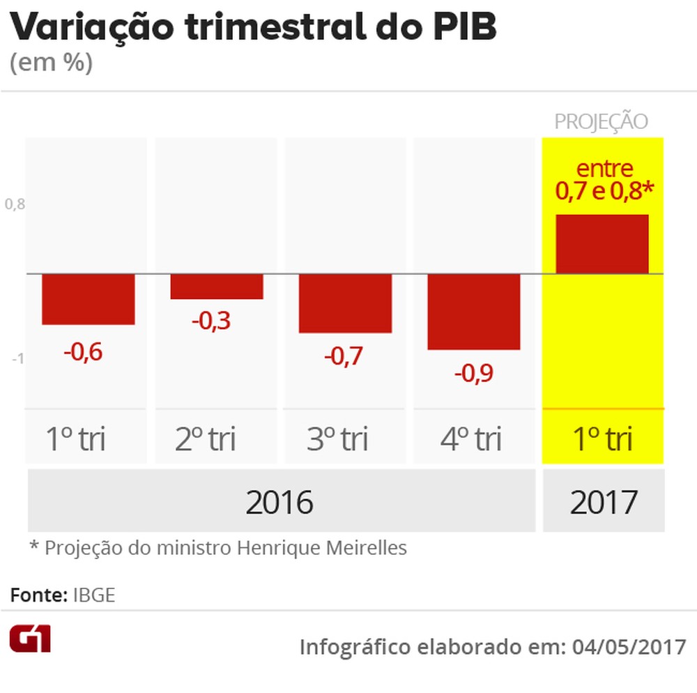 O ministro da Fazenda, Henrique Meirelles, estima que a economia deve ter crescido entre 0,7% e 0,8% entre janeiro e março, na comparação com o quarto trimestre do ano passado. Já as projeções do mercado variam de 0,4% a até mais de 1%. Para o ano, a maioria dos analistas continuam esperando um crescimento abaixo de 0,5%. Os números oficiais do PIB do 1º trimestre serão divulgados pelo IBGE no dia 1º de junho.